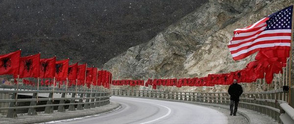 Alrededores de la capital Prístina en febrero de 2009 durante las celebraciones oficiales del primer aniversario de la independencia unilateral de Kosovo. La decoración está presidida por una bandera de Estados Unidos flanqueada por decenas de banderas de Albania de menor tamaño. Ni una sola insignia del autoproclamado nuevo país aparece por ningún lado. [Foto: Reuters]