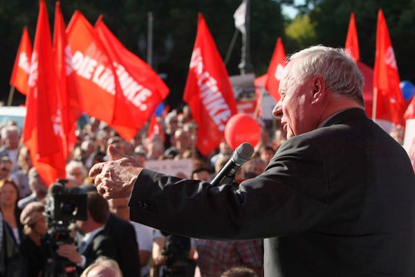 Oskar Lafontaine se dirige a los asistentes a un acto de Die Linke (la izquierda alemana) contra la guerra y por la retirada de las fuerzas de ocupación en Afganistán celebrado el pasado mes de septiembre en Berlín.