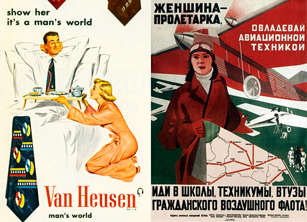 Izquierda:Publicidad comercial publicada en Estados Unidos en la década de 1950, más de siglo y medio después de la Revolución Americana. Vemos aquí claramente el papel que se otorga a la mitad de los súbditos del país líder del «mundo libre» (de las corbatas que anuncian, mejor no opinamos). Derecha: Cartel publicitario impreso en la URSS en 1935, 18 años después de la Revolución de Octubre. Se hace un llamamiento a las mujeres soviéticas para que se matriculen en las facultades de Ingeniería Aeronáutica.
