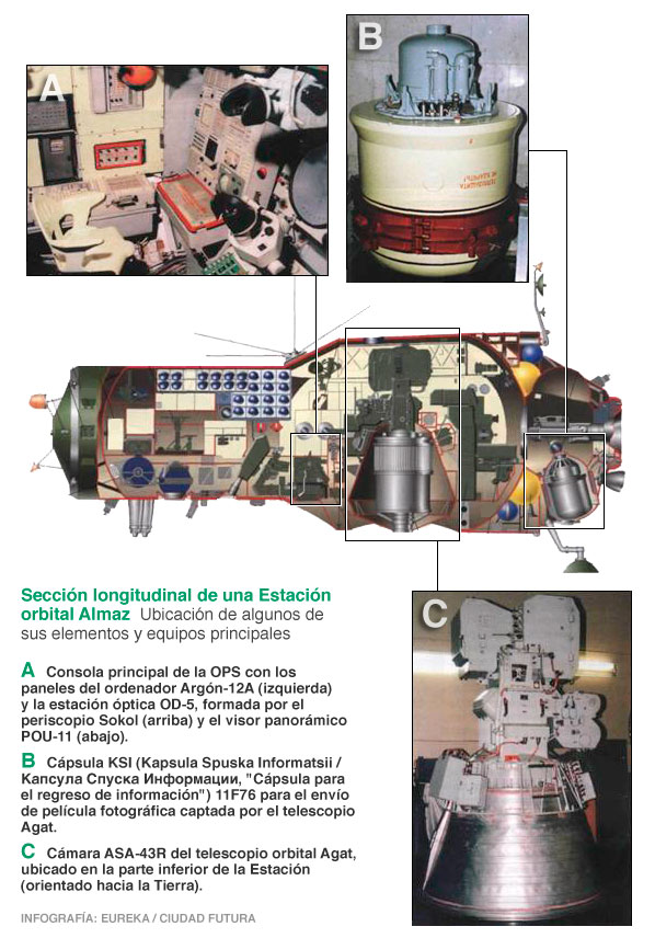 Almaz era un proyecto ambicioso. La estación espacial (11F71) se denominaría OPS (Orbitalnaia Pilotiruemaia Stantsia / Орбитальная Пилотируемая Станция, ОПС, «Estación orbital tripulada») y estaría equipada con un enorme telescopio Agat-1 («ágate»). El Agat no era cualquier cosa. Con un espejo de dos metros de diámetro y 7,2 metros de focal, era una especie de Hubble de los años 60. Eso sí, apuntando en la dirección «equivocada». Las OPS contarían también con pequeñas cápsulas automáticas (11F76) para enviar a la Tierra la película fotográfica con las preciadas imágenes captadas por la cámara ASA-43R del Agat. La estación debía tener un radar de apertura sintética para labores de espionaje en condiciones climatológicas o de iluminación poco favorables. Un cañón de 30 mm construido por la oficina de Alxánder Núdelman se encargaría de mantener alejados a los posibles satélites enemigos que quisieran inspeccionar la «fortaleza» espacial soviética.  Sigue leyendo