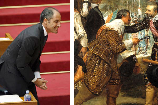 Aunque ambas imágenes muestran parecidos más que razonables en el gesto, también son muchas las diferencias. No sólo los trajes (los famosos trajes) de los protagonistas son muy diferentes; la moda ha cambiado mucho desde el siglo XVII y los precios de los trajes suponemos que también, aunque Francisco Camps no entienda mucho de precios… al parecer otros le pagaban sus trajes. Mientras que el holandés Justino de Nassau entrega las llaves de la ciudad de Breda al genovés al servicio de España Ambrosio de Spinola en el cuadro del genial Velázquez, Francisco Camps no entrega ninguna llave a nadie y se frota las manos… Aunque acosado él y su partido por investigaciones judiciales por graves cargos de corrupción, Camps sólo responde ante Dios y ante la Historia y hace poco se ha autoproclamado candidato del PP a la Presidencia de la Comunidad Valenciana para ser reelegido. Lo de los jueces… «largo me lo fiáis». Su correligionario Carlos Fabra, presidente de la Diputación Provincial de Castellón y «ciudadano ejemplar» (Rajoy dixit) está imputado desde hace años por graves e incontables delitos de corrupción y sólo en caricaturas lo hemos visto lucir traje a rayas (cuyo coste correría a cargo de Instituciones Penitenciarias en este caso). Camps declaró en una ocasión que «Castellón tenía una enorme suerte por contar con Fabra»… para suerte enorme la del susodicho, cuya coartada para justificar sus abultados ingresos ha sido que le ha tocado en sucesivas ocasiones la Lotería. Y eso que dicen que el azar tiene leyes.