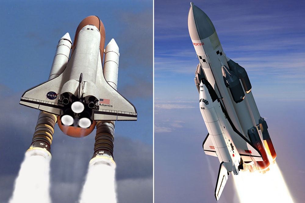 Ilustraciones del transbordador espacial de EEUU ‘Atlantis’ (izquierda) y de la lanzadera soviética Burán (derecha) en pleno despegue. [Clic en la imagen para ampliar]