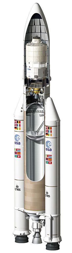 Derecha: Ilustración del lanzador Ariane 5 ES con el carguero automático ATV inserto en la cofia superior del cohete europeo en su configuración en el lanzamiento. [Ilustración: ESA]