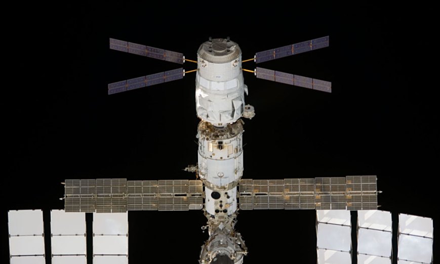 Fotografía superior: El ATV-1 Jules Verne acoplado al módulo Zvezda del Segmento ruso de la ISS en 2009. [Foto: NASA; clic en la imagen para ampliar]