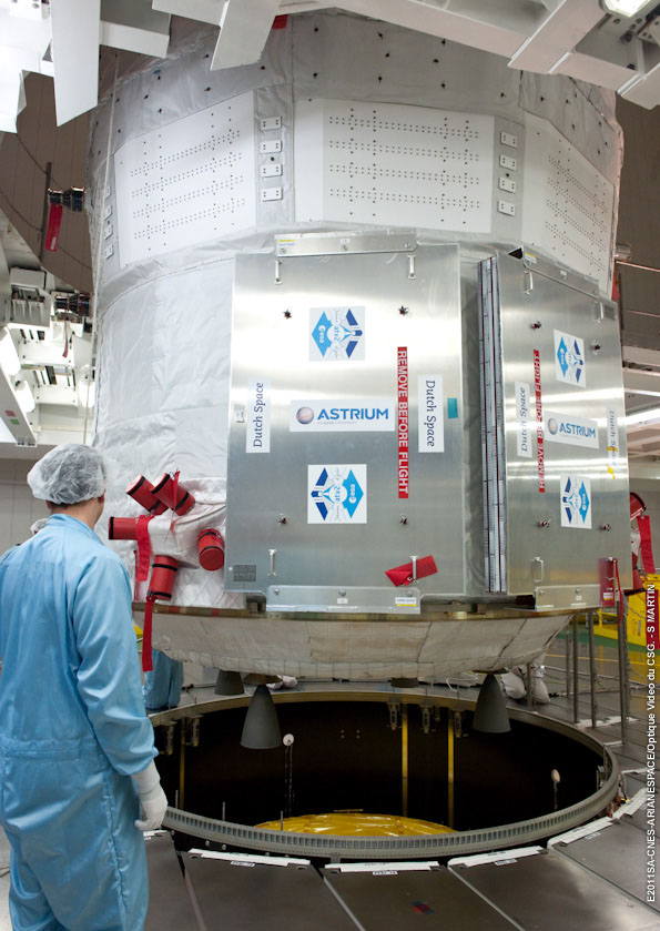 En la imagen podemos ver una de las secuencias finales de introducción del ATV-2 Johannes Kepler en la fase superior del cohete Ariane 5 ES en las instalaciones del edificio de ensamblaje final de este lanzador en el Centro Espacial de Kourou. Lo que se divisa en la fotografía es sólo una parte de la nave: su mitad inferior o posterior no presurizada, con la Sección de Aviónica y el Módulo de Propulsión (el cilindro inferior).