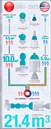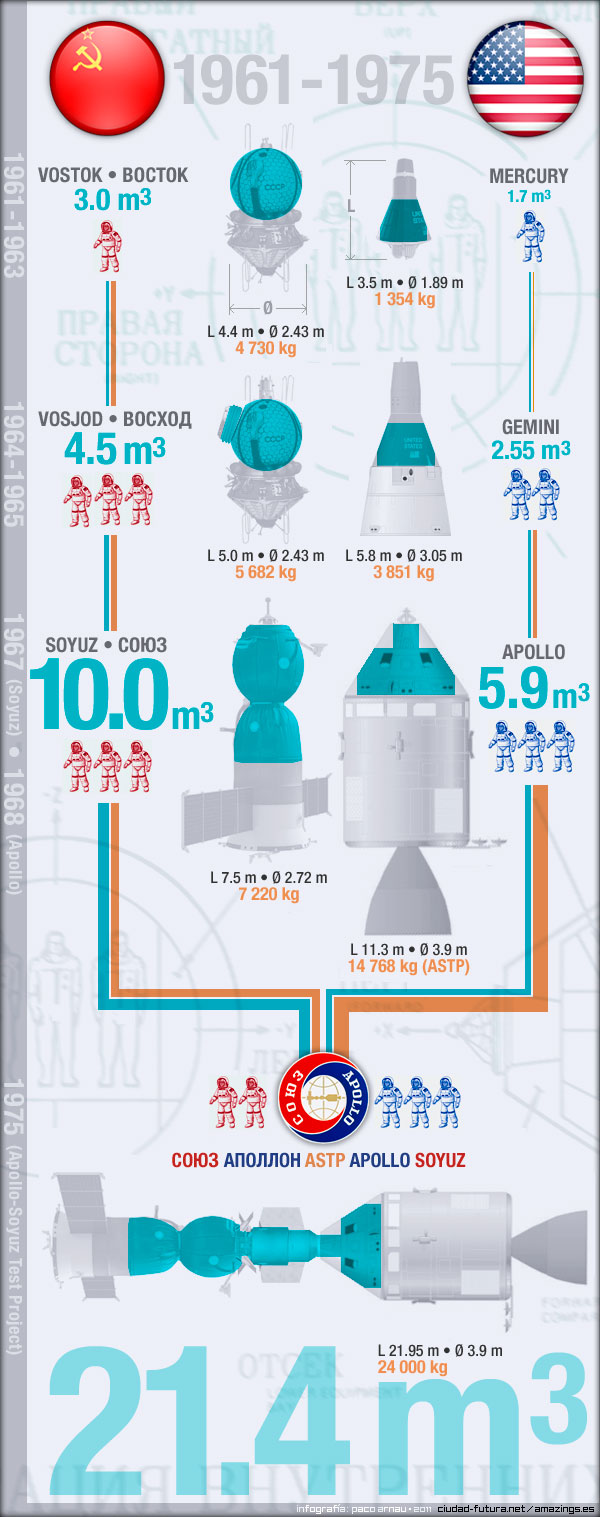 Representación gráfica del volumen habitable comparado con la masa de los seis tipos de naves orbitales tripuladas de la carrera espacial entre la URSS y EEUU (1961-1975). [Infografía de Paco Arnau / ciudad-futura.net para Amazings.es]