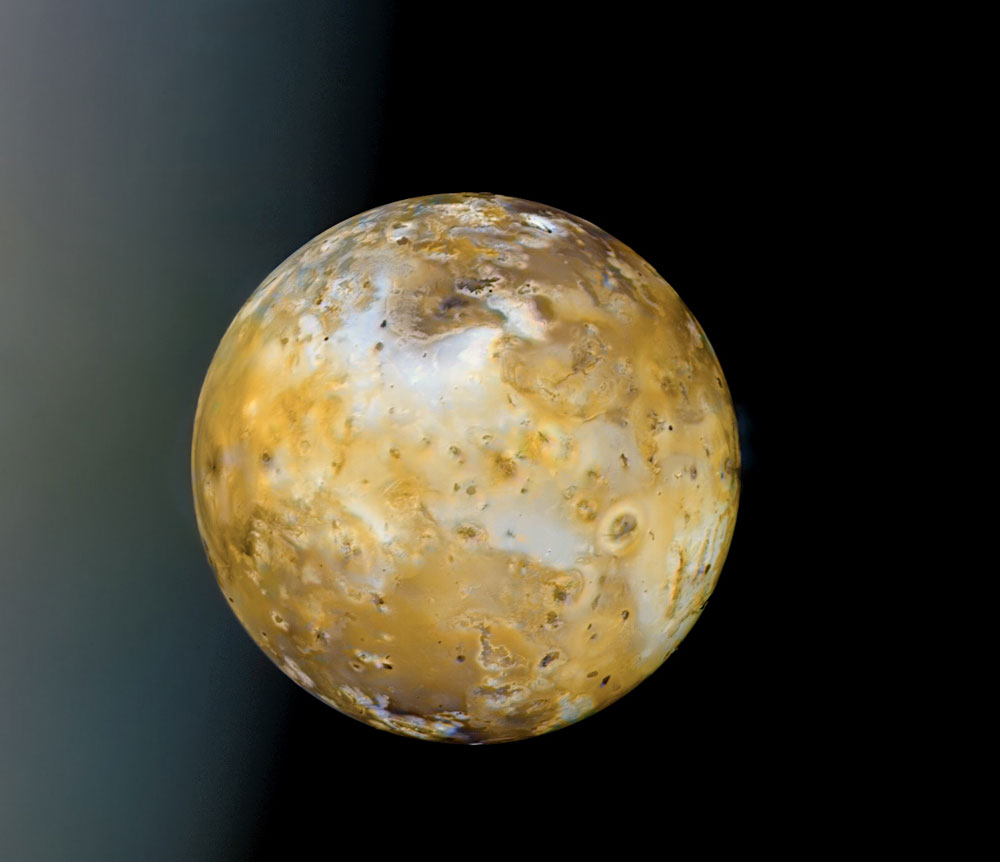 Ío es el satélite galileano más cercano a Júpiter y fue descubierto por el gran astrónomo italiano Galileo Galilei en 1610. La sonda de la NASA Voyager 1 visitó el sistema planetario de Júpiter en 1979 [véase infografía en ciudad-futura.net]. Esta magnífica imagen es un reprocesamiento digital actual, que se acaba de publicar, basado en los bellos mosaicos de fotografías que envió el Voyager 1 allá por finales de la década de 1970. Una intensa y pertinaz actividad volcánica provocada por las mareas gravitatorias de la gran masa de Júpiter, combinadas con los efectos de las cercanas lunas jovianas Europa y Ganímedes, ha modelado —y sigue remodelando— el aspecto de Ío, el otro cuerpo del Sistema Solar junto con la Tierra que mantiene un vulcanismo activo visible y constatable. La banda más clara de la izquierda son las capas altas de la inmensa atmósfera de Júpiter. Junto a volcanes activos, en la superficie de este mundo de fuego —de tamaño ligeramente superior a nuestra inerte Luna— hay lagos de azufre fundido y lenguas de lava semiviscosa de varios cientos de kilómetros de longitud. [Imagen: ©Ted Stryk, procesada a partir de datos facilitados por cortesía de NASA/JPL. Clic en la imagen para ampliar]