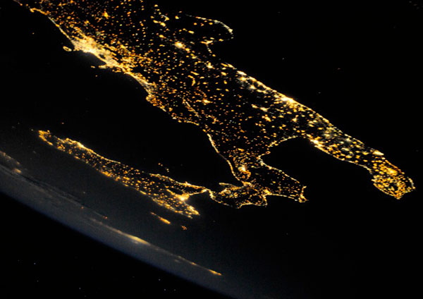 Foto tomada por Douglas Wheelock (NASA) desde la Estación Espacial Internacional el 22 de agosto de 2010. El astronauta estadounidense definió esta imagen como «La belleza de Italia en una clara noche de verano». Para que podamos distinguir como en los mapas el extremo sur de la bota de la península itálica y la isla de Sicilia —a su izquierda o al Oeste— hemos girado 180º la imagen original. Las luces del área metropolitana de Nápoles y su bahía destacan en la zona superior izquierda de la imagen. Los destellos luminosos que se divisan en el horizonte terrestre (en la parte inferior izquierda) deben corresponder a Túnez y la costa septentrional de África. [Foto: NASA/Douglas H. Wheelock]