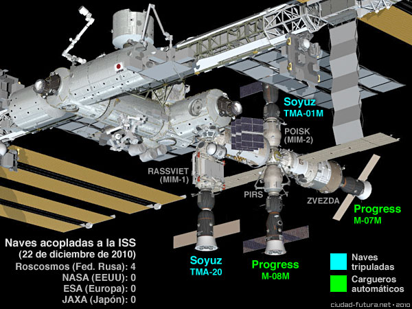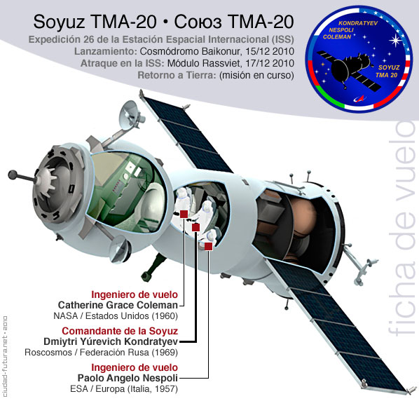 P.s.— A partir de ahora ofreceremos a nuestros ciudadanos y amigos un nuevo servicio: fichas de los vuelos cosmonáuticos (en principio tripulados), que iremos actualizando a medida que se realicen; fichas con los datos básicos y emblemas de cada misión así como de sus integrantes, incluyendo su cargo, agencia, nacionalidad y posición a bordo. La que aparece sobre estas líneas es la primera de estas «tarjetas de embarque», que —como no podría ser de otra forma— es de una misión Soyuz, la reciente TMA-20 (Expedición 26 de la ISS). No satisfechos con esto, y por el mismo ‘precio’, añadimos también una infografía con las naves acopladas a la ISS a fecha de hoy…