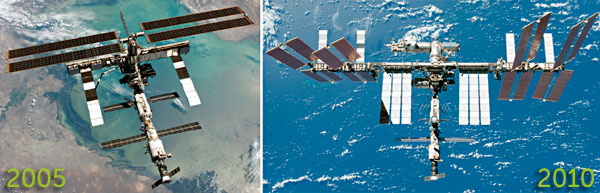 Arriba: Evolución de la ISS en los últimos cinco años (2005-2010). Abajo: Vista general de la parte central de la ISS en una foto captada por los tripulantes de la misión STS-132 (Shuttle ‘Atlantis’). En primer plano de izquierda a derecha: los módulos de experimentación científica Columbus (ESA, Europa) y Kibo (JAXA, Japón); tras ellos, el laboratorio estadounidense Destiny (NASA) y la estructura central que da soporte a los paneles de control térmico, a los paneles solares fotovoltaicos, a los sistemas de comunicaciones y al brazo robótico móvil de la estación. Al fondo, el segmento ruso con una de las naves Soyuz acopladas. [Fotos: NASA]