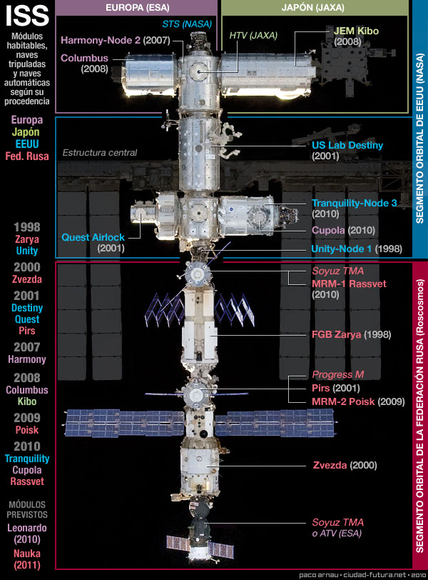 En la infografía también se representan en su ubicación correspondiente las naves de servicio (en cursiva), tanto para el transporte de tripulaciones hasta y desde el complejo orbital internacional como las naves automáticas de avituallamiento de víveres, oxígeno, combustible y repuestos que prestan servicio a la ISS. En la infografía destacamos la procedencia de los módulos por país de origen en función de dónde fueron fabricados y la distribución operativa de la ISS, basada en dos segmentos orbitales: uno a cargo de la NASA (Segmento Orbital de Estados Unidos, en azul) y otro a cargo de Roscosmos (Segmento Orbital de la Federación Rusa, en rojo). A finales de 2010 y en 2011 está previsto el acoplamiento a la ISS de dos nuevos elementos: el módulo europeo de fabricación italiana Leonardo y el módulo científico ruso Nauka, respectivamente.