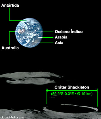 El cráter que aparece en primer plano y que destacamos en la ilustración anotada es el Shackleton, situado en unas coordenadas muy próximas al Polo Sur de nuestra Luna (89.9ºS-0.0ºE). Fue llamado así en homenaje al explorador irlandés Ernest Shackleton, que comandó la expedición transantártica Endurance a principios del siglo XX (1914-1916). Este cráter de impacto tiene un diámetro de 19 km y una profundidad que puede llegar nada menos que a 4.200 metros [editado]. En la región polar que rodea al Shackleton, valorada como posible ubicación para futuras bases lunares humanas, hay zonas expuestas a la luz solar de forma casi permanente debido al escaso ángulo de inclinación del eje lunar en relación con el plano de la órbita del sistema Tierra-Luna (eclíptica) alrededor del Sol (5º); por el contrario, en las profundidades de este cráter la oscuridad es perpetua. [Imágenes: JAXA/NHK • Texto e ilustración: Paco Arnau / Ciudad futura]