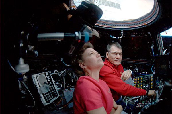 Paolo Nespoli (Milán, Italia, 1957), de la Agencia Espacial Europea (ESA), y Catherine Coleman (Charleston, Carolina del Sur, EEUU, 1960), de la NASA, inician la operación de acoplamiento del HTV2 desde el módulo acristalado Cupola de la ISS.
