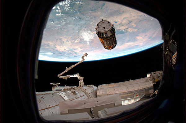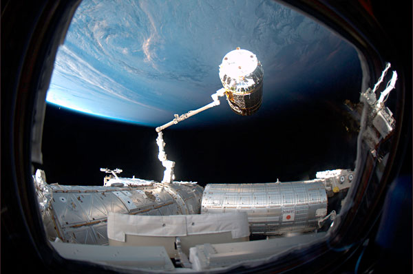 El astronauta italiano de la ESA (Agencia Espacial Europea por sus siglas en inglés) Paolo Nespoli nos ofrece en su página Flickr magisstra’s photostream una serie de magníficas fotografías en las que podemos observar cómo un brazo robótico canadiense de la Estación Espacial Internacional (ISS) captura el carguero orbital japonés HTV2 Kounotori para su acoplamiento al Nodo 2 (contiguo al módulo-laboratorio Kibo de la agencia espacial japonesa JAXA y al laboratorio europeo Columbus); todo un ejemplo de lo que significa en la práctica la cooperación internacional en el espacio. Las imágenes de esta operación en órbita fueron captadas los pasados días 27 y 28 de enero por el propio Paolo Nespoli con su cámara. El sistema de acoplamiento de los cargueros japoneses HTV parece un tanto rudimentario si lo comparamos con el sistema automático activo de cita espacial KURS de los cargueros rusos Progress o del vehículo de carga automático europeo ATV, que son capaces de acoplarse al Segmento ruso de la ISS con medios propios gracias a ese sofisticado sistema de diseño soviético del que también están dotadas las naves tripuladas Soyuz. En cualquier caso, el procedimiento no deja de ser sencillo pero efectivo si nos remitimos a los resultados: atrapar un cuerpo en óbita de 16 toneladas y media con un brazo mecánico y acoplarlo a la ISS mientras ambos orbitan la Tierra a más de 28.000 km/h…