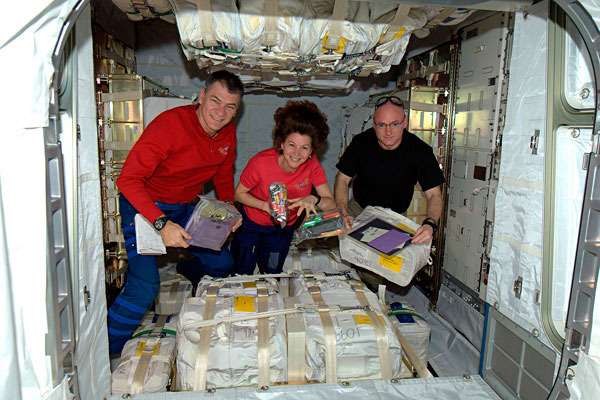 Tres de los seis tripulantes actuales de la ISS —Paolo Nespoli (ESA), Catherine Coleman (NASA) y el comandante de la Expedición 26 Scott Kelly (NASA), de izquierda a derecha— descargan paquetes de víveres y equipos desde el interior del módulo presurizado del HTV2 una vez que éste fuera acoplado horas antes al Nodo 2 de la Estación.