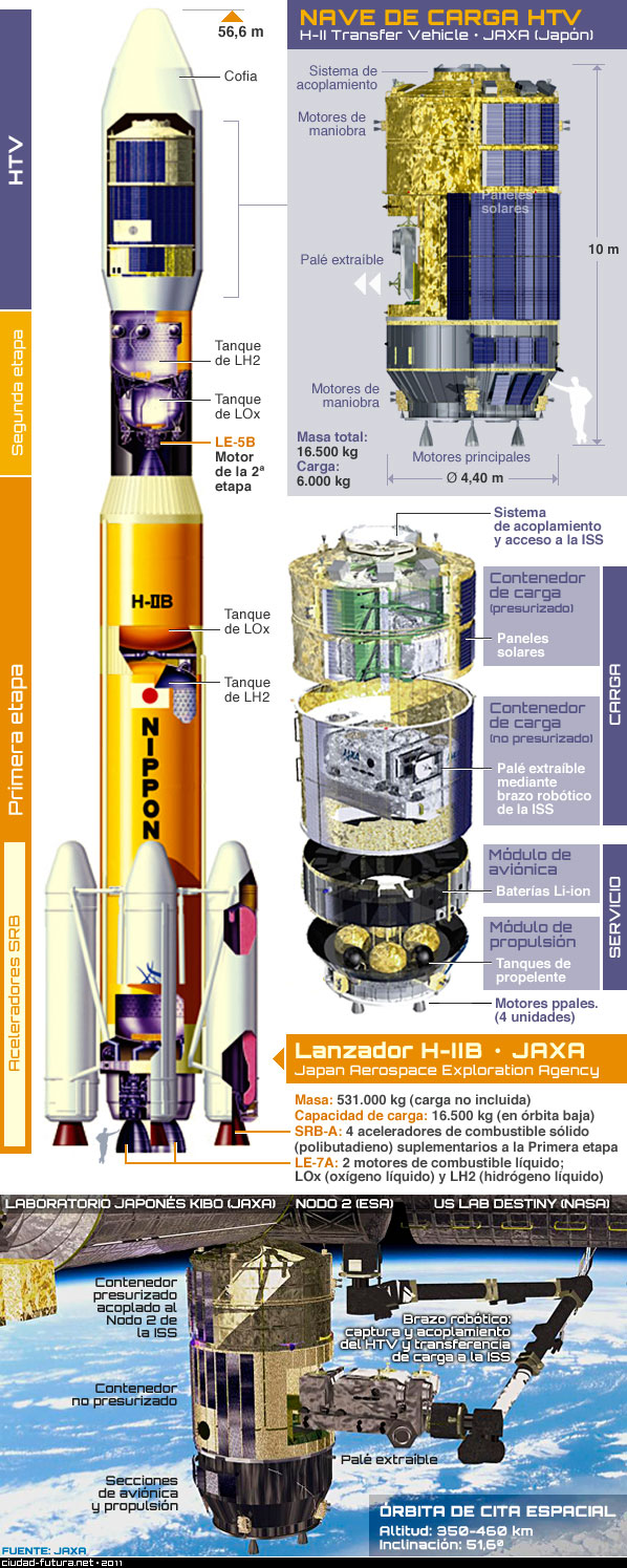 P.s.: Con motivo del próximo lanzamiento del HTV-2 Kounotori estamos preparando una infografía lo más completa posible de este sistema japonés de cargueros espaciales H-IIB-HTV, que esperamos ofreceros en torno a la fecha en que la «Cigüeña» remonte el vuelo.