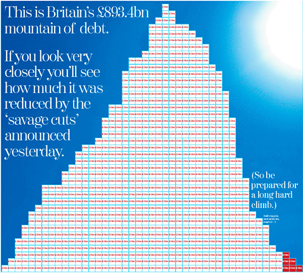 La infografía¹ que ocupa la primera página del diario londinense The Independent del 25 de mayo representa el monto total de la deuda pública de Gran Bretaña (la mayor de Europa) y, comparativamente, los recortes del gasto público anunciados por el nuevo gobierno liberal-conservador de Su Majestad. Estos recortes que en buena parte afectan (cómo no) al gasto social del Estado británico y que ascienden a 6.250 millones de libras (más de 7.300 millones de euros) para el ejercicio fiscal 2010-2011, parecen muy poco si lo comparamos con la montaña de libras que eleva la soberana deuda del Estado británico a la estratosférica cifra de 893.400 millones de libras. Las cifras de esta montaña producen vértigo, pero más aún si echamos un rápido vistazo a lo que en realidad suponen.