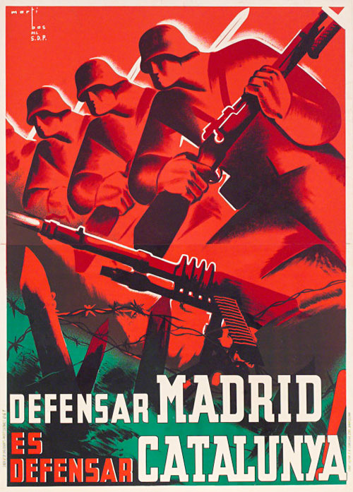 Cartel «Defender Madrid es defender Cataluña» (texto en catalán en el original; litografía en color de 1937, 139×100 cm). Autor: Martí Bas / Sindicato de Diseñadores Profesionales de UGT-Catalunya.