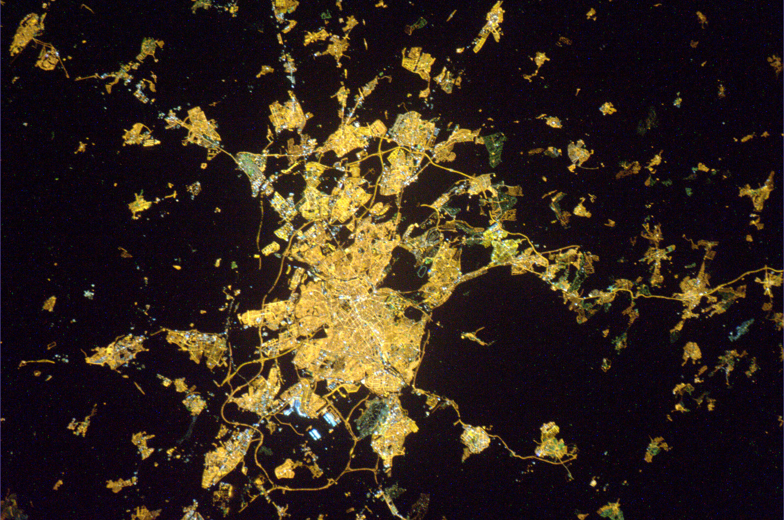 El astronauta de la ESA (Agencia Espacial Europea) Paolo Nespoli (Expedición 26 de la ISS) casi cada día nos sorprende con nuevas instantáneas captadas desde el módulo Cupola de la ISS, el lugar preferido para pasar los escasos ratos de ocio por parte de los tripulantes de la Estación orbital internacional por sus magníficas vistas. Nespoli cuelga sus fotos de forma habitual en su página de Flickr para compartirlas con todos nosotros. Lo que aquí vemos es la capital de España, de noche y desde nuestro espacio orbital, a unos 400 km de altura. Sorprende el nivel de detalle si ampliamos la imagen, que permite ver —como si de un plano iluminado se tratara— Madrid y su área metropolitana, reconociéndose a simple vista las principales avenidas y calles de la capital así como las poblaciones periféricas de su conurbación metropolitana. [Vía: @JavierRobledano en Twitter]