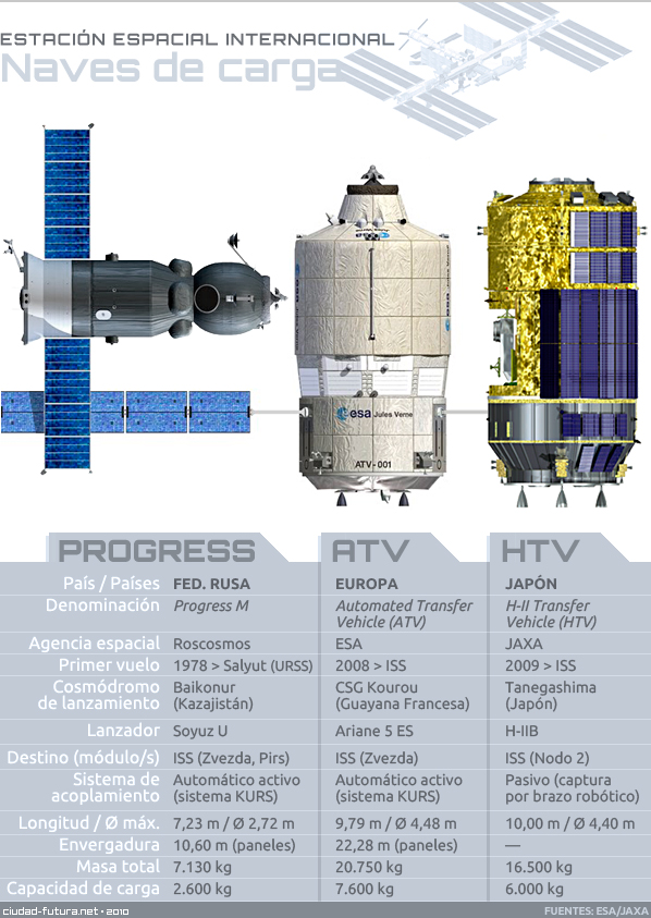 Os presentamos una infografía comparativa a escala con los principales datos y parámetros de las naves automáticas de carga que operan en la actualidad con destino a la Estación Espacial Internacional (ISS): Progress (Federación Rusa), ATV (Agencia Espacial Europea) y HTV (Japón). Progress: 127 vuelos realizados hasta la fecha (1978-2010) con destino a las estaciones orbitales Salyut (URSS), Mir (URSS/Fed. Rusa) e ISS. ATV: Un vuelo realizado con destino a la ISS en 2008. HTV: Un vuelo realizado con destino a la ISS en 2009.